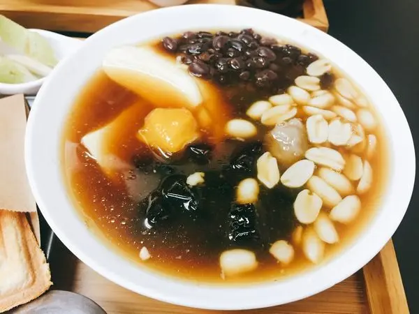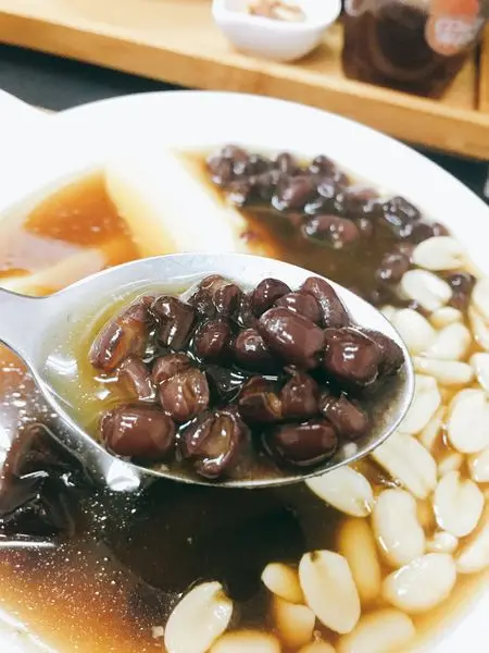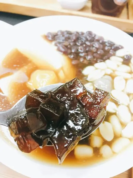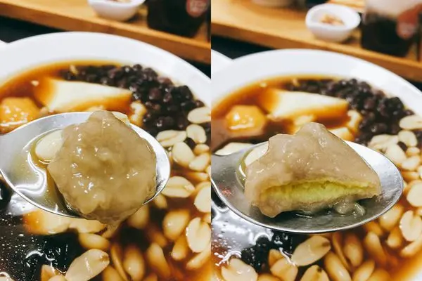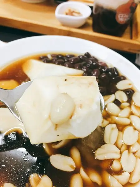 一般的豆花店都是搭配粉圓,果核豆花用的是方塊狀的粉圓