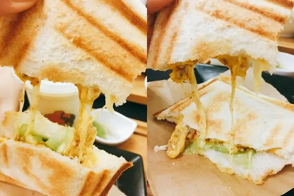 吐司烤的酥酥脆脆,裡面夾著牽絲的起司跟半熟蛋
