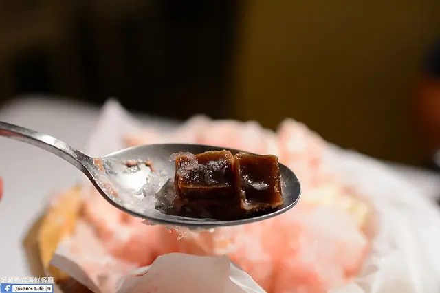 剉冰上淋上了櫻花醬,讓冰稍微上了一層粉粉的顏色