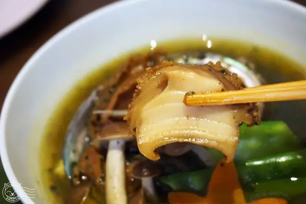 看起來綠綠的湯是用鮑魚熬成的,再加上蕈菇、豆豆、紅蘿蔔和整顆連殼的鮑魚,