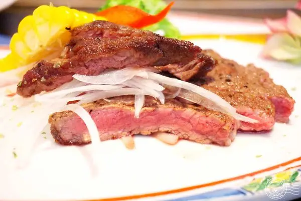 上桌的烤牛排散發出烘烤的香味,5分熟的粉紅色澤讓星羽猛吞口水,