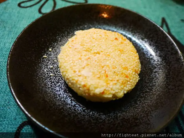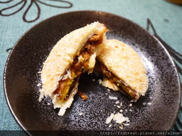 芝麻燒餅中間夾了一層鹹蛋黃跟肉鬆,