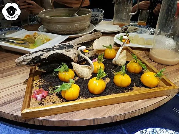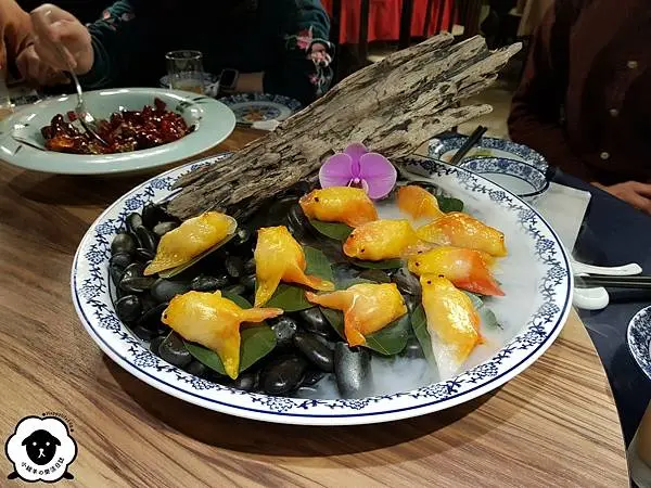 一顆顆金魚造型的餃子,底下還有陣陣乾冰冒出來,恭喜它榮登本日最浮誇料理XD