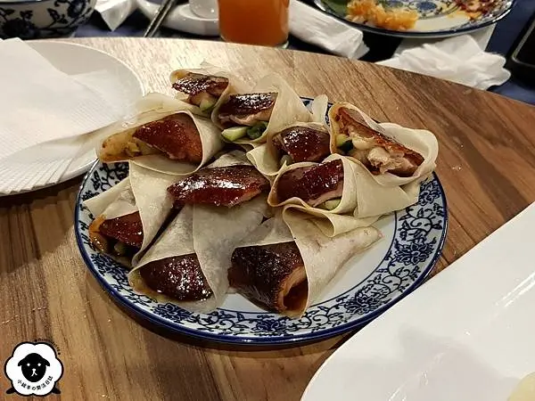 一樣會有師傅推著餐車到桌邊片鴨,不一樣的是店員會幫忙將烤鴨、蔥段與黃瓜包成捲餅讓客人直接享用。