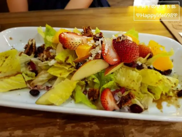 選用的素材相當豐富,包含了草莓、蘋果、橙橘、焦糖胡桃和蔓越莓乾,基底的醬汁是橙香醋醬。
