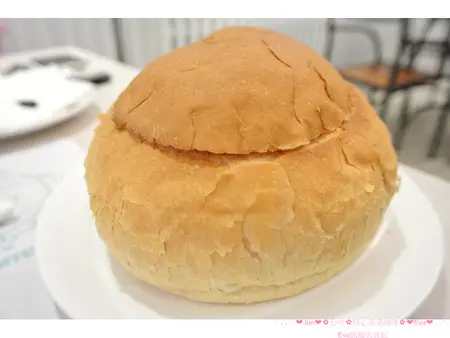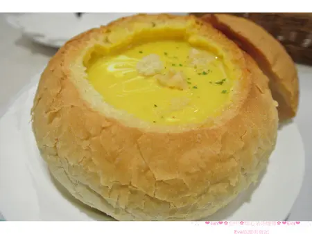 濃湯部份我很喜歡! 味道濃郁而不膩! 而且裝濃湯的麵包,也是可以吃的喲! 當然,不能邊喝邊吃啦!((不然湯會整鍋流出來~ 但可以等到湯喝到一定高度後,就可以開始吃麵包囉!