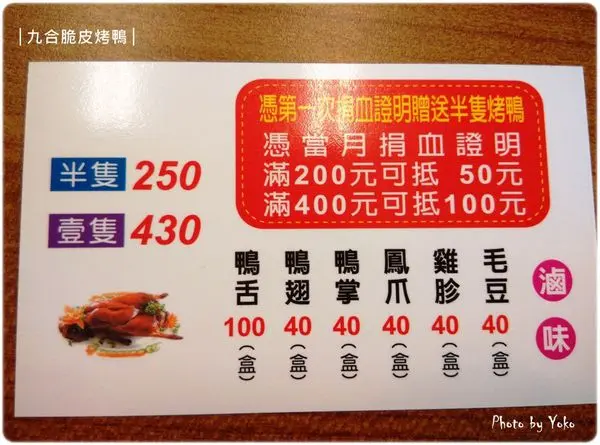 【九合脆皮烤鴨】長期鼓勵捐血行動,因此只要憑第一次捐血證明就贈送半隻烤鴨!
