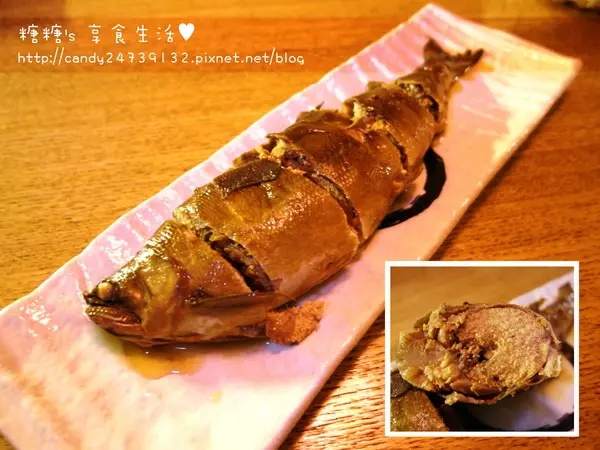 滷香魚 220元 將香魚先烤過,再以文火滷至長達7小時,最後在拿去冰鎮,讓香魚吃起來冰涼無腥味最厲害的是這整條香魚從頭到尾完全吃不到任何一根刺,師傅已將魚刺滷到幾乎都化掉讓顧客享用這道滷香魚時,完全不用煩惱要一根根的挑魚刺,還可以吃到滿滿的魚卵