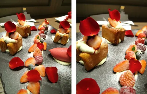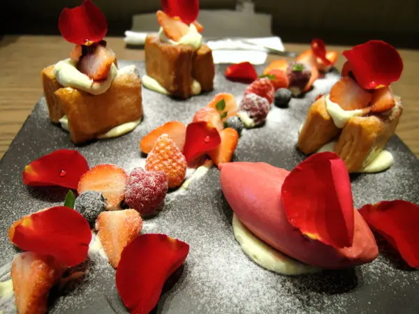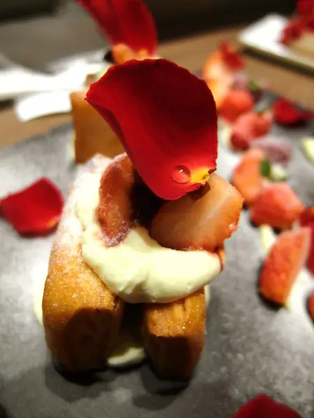 酥脆的千層酥加上草莓、玫瑰花瓣、羅勒卡士達及玫瑰醬