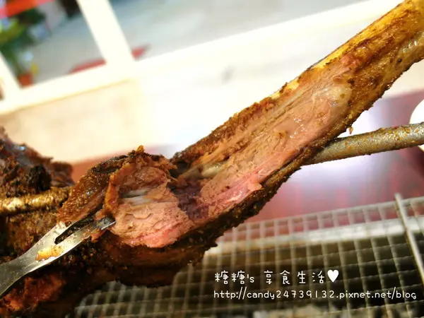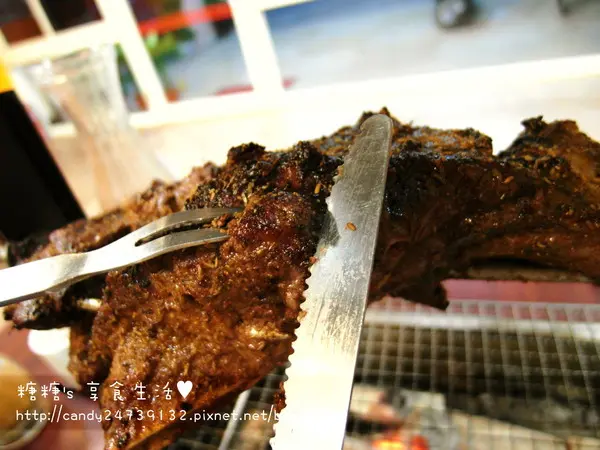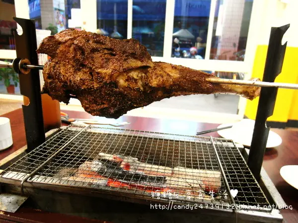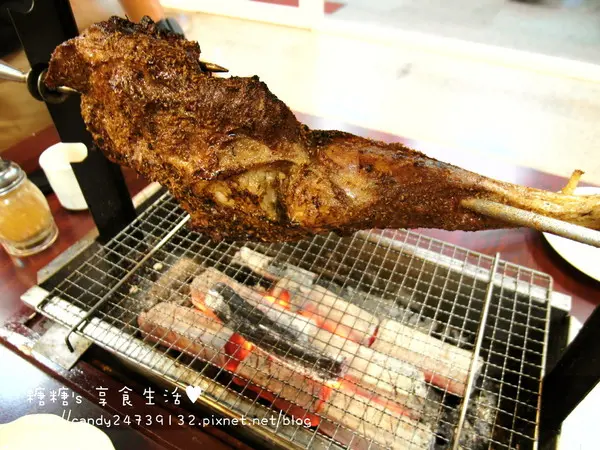 碳烤羊腿 期待已久的羊腿終於登場囉,羊腿好大一隻,重量大約在1.2公斤左右,是3-4人的份量老闆特別選用紐西蘭6個月大的小羔羊,肉質較軟嫩多汁,再經過老闆加工處理進行醃製需要花較長的時間,建議大家要吃羊腿的話,先提前1-2天電話預定,讓老闆是先準備唷