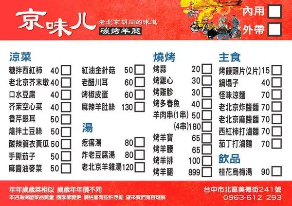 將最精華的腳筋部位,邊邊烤至帶有些許的焦脆感,咬下去還會發出卡滋的酥脆聲響慢慢咀嚼,會吃到Q軟帶有咬勁的腳筋,讓人越嚼越香,越吃越入味,不塊是精華地帶 想吃道地的北京菜又怕傷荷包嗎,京味兒為顧客獻上道道最道地的精選北京好料讓顧客們不用再跨海就可直接在台品嘗,不但省了荷包,還能滿足您的味蕾快來京味兒這享受平價又大快朵頤的滋味吧,記得來之前要先提前預約唷 《店家資訊》 店家:京味兒 電話:0963-612293 地址:台中市北區美德街241號 時間:17:00~22:00;週二店休