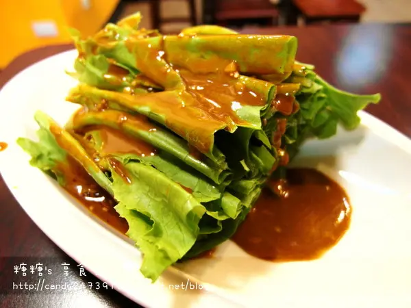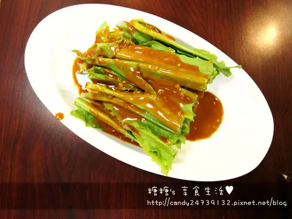 麻醬油麥菜 油麥菜其實就是大家俗稱的A菜,京味兒將A菜洗淨後,直接淋上店家特調的醬汁沒錯!!就是直接生吃的意思,這也是糖糖第一次吃到生A菜呢