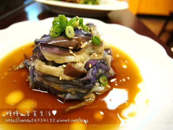 手撕茄子 把川燙好的茄子撕成條狀後,在以繞圈圈的方式堆疊成塔的形狀接著淋上店家以醬油、陳醋及麻油調味而成的醬汁,是到非常清爽的經典涼菜