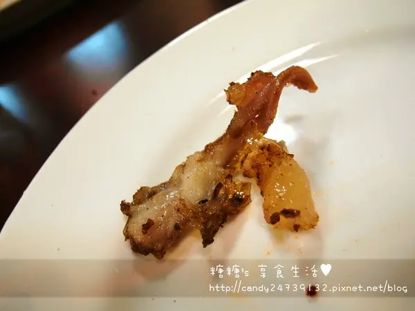 等到外層的肉吃得差不多時,剩下的骨頭跟帶筋的部分,老闆會幫忙我們處理過將骨頭剁開,把上面的肉切成塊狀,擺盤後再端上桌,沒想到吃快剩下骨頭的羊腿經過老闆處理後,份量還可以這麼多,本以為老闆會把骨頭丟到,然後弄個小碟子來裝肉結果上桌竟然這麼大一盤,老闆還將骨頭剁開,讓我們吃的到裡面的骨髓,超貼心的