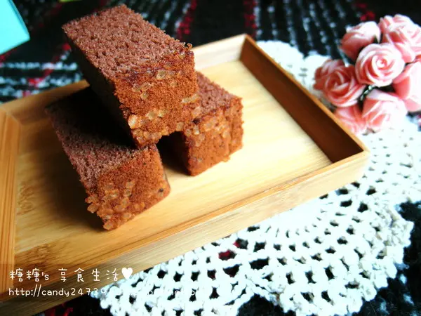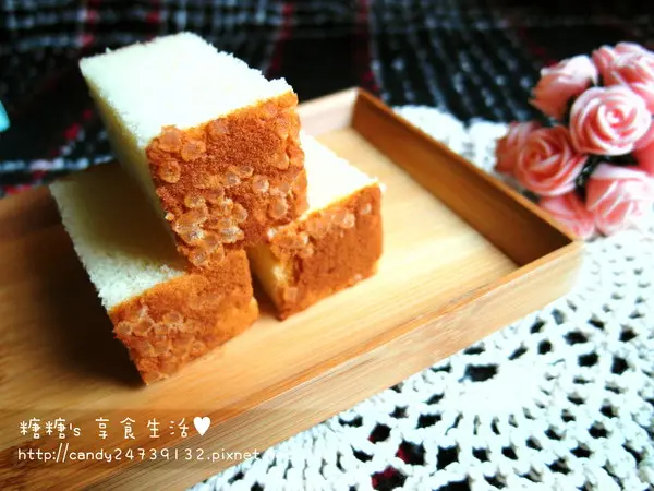 濃郁的雞蛋味中交織著淡淡的蜂蜜香氣,口感鬆軟綿密吃到底層的糖粒會稍微覺得甜一些,不過不會像市面上賣的蜂蜜蛋糕那樣膩口