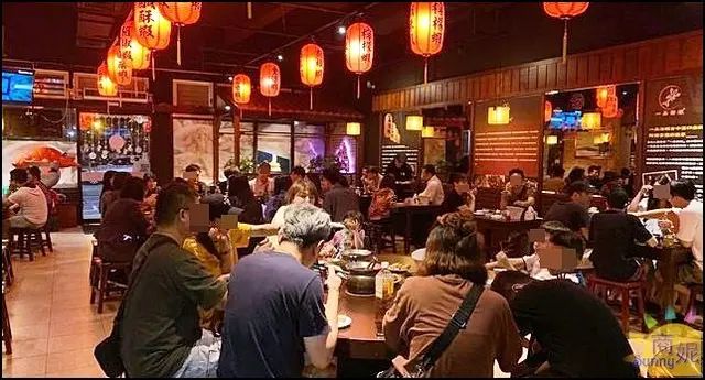 天花板掛著好多大紅燈籠,寫著各種蝦子口味,充滿熱鬧氣氛。營業時間從晚上5點到凌晨3點越晚越熱鬧。