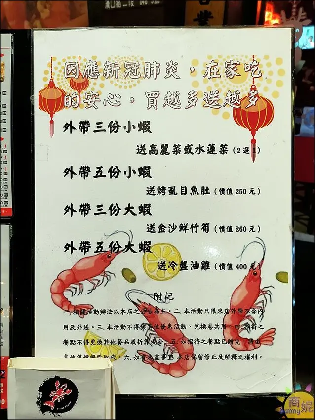一品活蝦優惠 一品活蝦外帶免服務費還有送招牌菜很超值,先打電話預約再到現場取餐很方便。沒空到店也有外送服務,外送範圍請電話詢問。