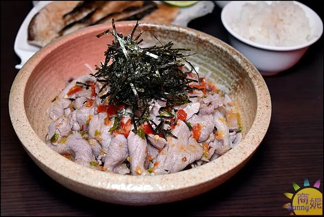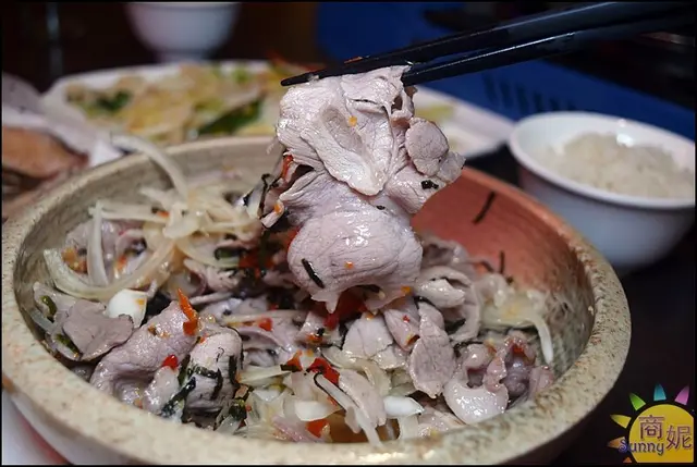 梅花豬肉不是火鍋肉片,而是有點厚度的手切肉。口感軟嫩帶點Q度,淋上酸酸辣辣的泰式醬汁,非常開胃。