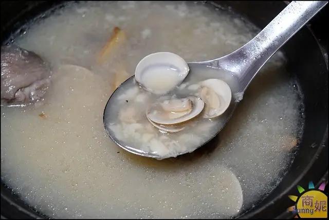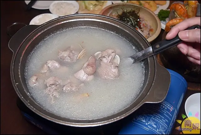 雞湯很大一鍋,裡頭的雞肉有雞腿、雞胸綜合部位,還有蛤蜊一鍋料不算少。