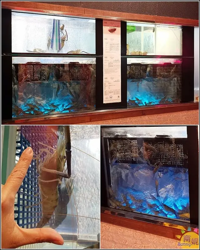 店內的活蝦都是新鮮進貨,牆面上有通過SGS檢驗合格證書。
