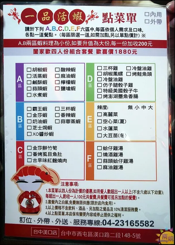一品活蝦最新優惠 店門口就有菜單,價格透明。粉絲團經常推出優惠活動,目前優惠是外帶不限金額免服務費,再加碼送 招牌菜。