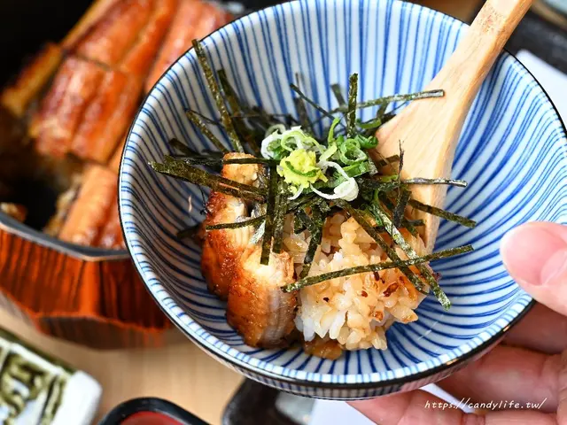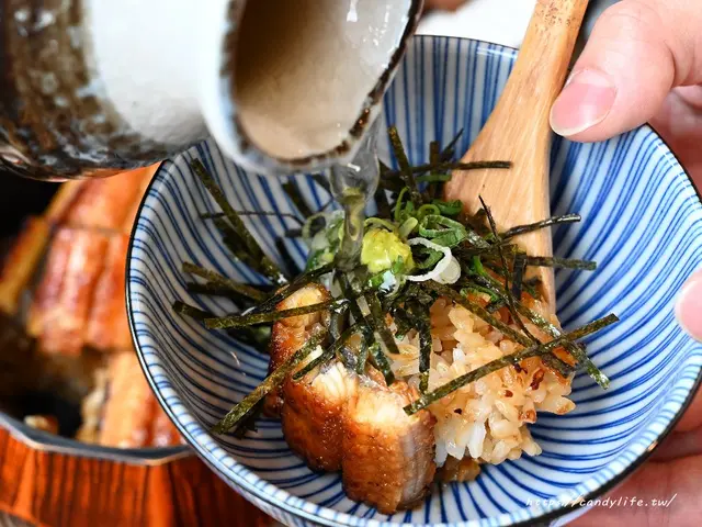 接下來鰻魚第二吃,將鰻魚飯佐上芥末、蔥花及海苔,讓鰻魚飯多了青蔥及芥末的香氣外,芥末的嗆辣還能帶出鰻魚的甘甜滋味,層次更豐富