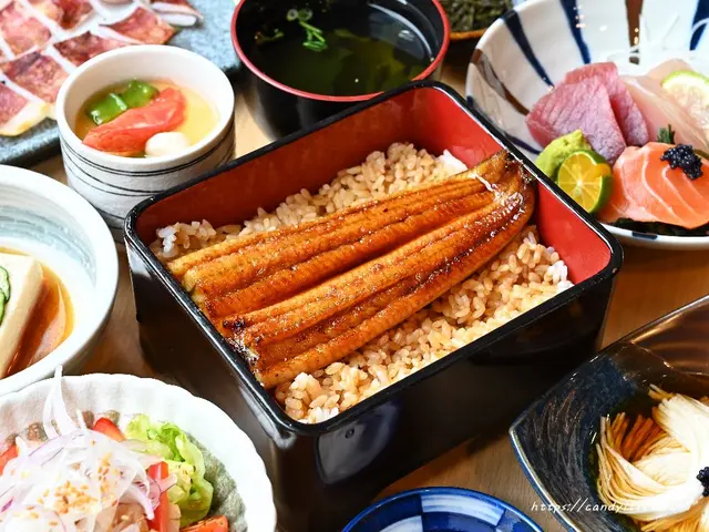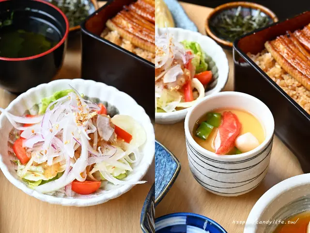 一鰻裡頭最澎派的套餐就是這道極上鰻魚飯套餐,裡頭除了半隻的鰻魚飯外,還多了現切生魚片,一鰻套餐內容均附柴魚高湯、當日小缽、沙拉、茶碗蒸及漬物,極上鰻魚飯套餐會再多一樣特色小菜