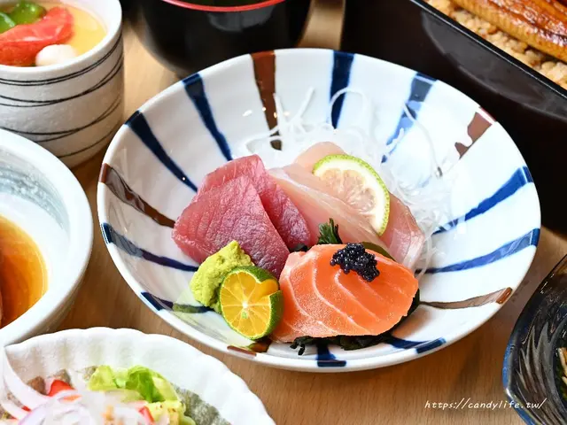 極上鰻魚飯套餐中附上的生魚片裡頭有鮭魚、旗魚及鮪魚,食材新鮮,肉質也相當鮮甜軟嫩呢