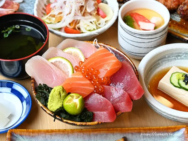 一鰻的特盛鮮魚親子丼是生魚片丼飯,裡頭包含了鮭魚、鮪魚、旗魚及鮭魚卵,生魚片相當厚切、整碗鋪得滿滿的,用料相當實在呢,旁邊一樣有附上柴魚高湯、當日小缽、沙拉、茶碗蒸及漬物