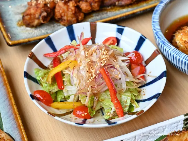 新鮮洋蔥現切搭配生菜、甜椒、番茄等,淋上和風醬汁,再撒上白芝麻,口感清爽又開胃