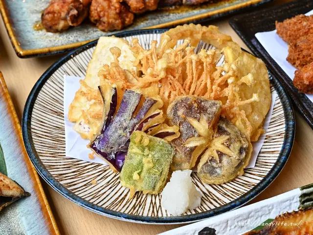 一鰻的野菜天婦羅食材依當天為主,今天點的裡頭有地瓜、南瓜、芋頭、金針菇、茄子及香菇,裹上麵衣下去炸至金黃酥脆,好吃不油膩,將蘿蔔放入天婦羅醬汁中,搭配天婦羅享用,微甜風味吃起來更加爽口