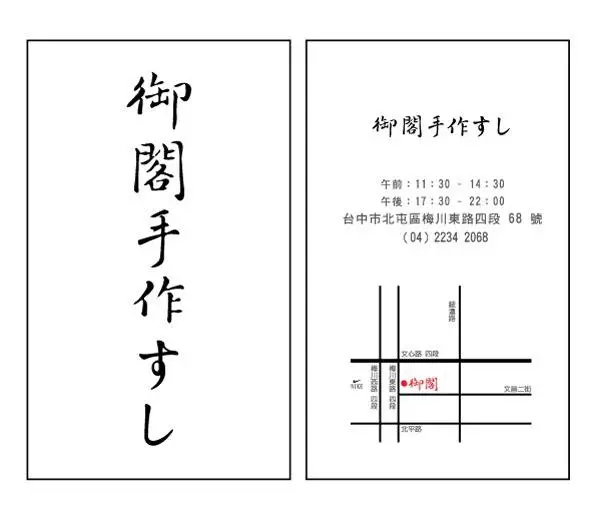 位在台中市北屯區的北平市場附近,靠近文心路口,德鑫如一隔壁處的御閣手作壽司