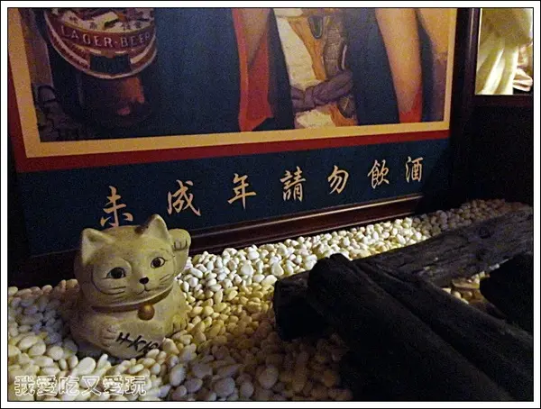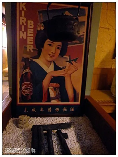 訴求日式風格的居酒屋,擺放許多小物、酒還播放日本電視歌唱