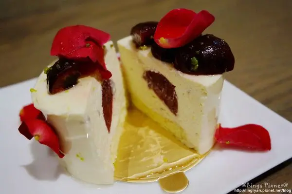 Mascarpone Cheese 慕斯、玫瑰覆盆子果凍、蜂蜜蛋糕、食用玫瑰