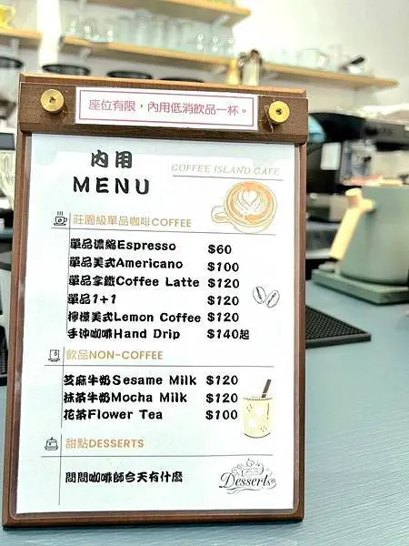 啡嶼店內MENU:莊園級精品咖啡(也有手沖咖啡)、飲品(還有花茶系列)以及甜點,溫馨提醒:現點現沖,需耐心等待,座位有限,內用低消一杯飲品,價格非常親民,咖啡大大滿足!