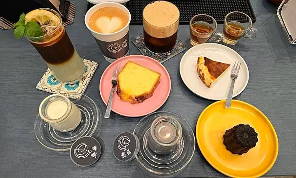 桌上飲品與甜點陸續一一出爐囉…有:春蒔拿鐵、秋葒冰美式、冬蘊冰美式、檸檬美式、老奶奶檸檬磅蛋糕、巴斯克乳酪、可麗露(原味),以及義式軟奶酪有香草和芝麻兩種口味,老爺拿起相機忍不住想拍下這畫面,梅子與友人在旁話家常,老爺終於喊開動囉…我們一行三個人先從咖啡開始嚐鮮了