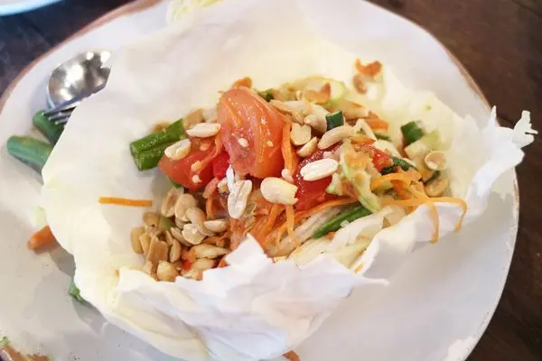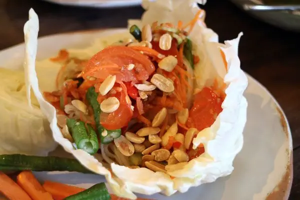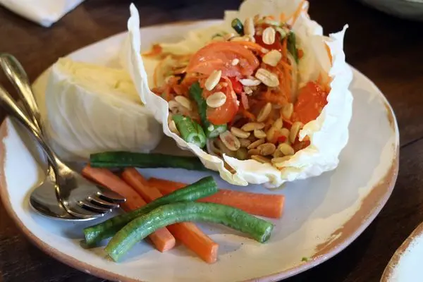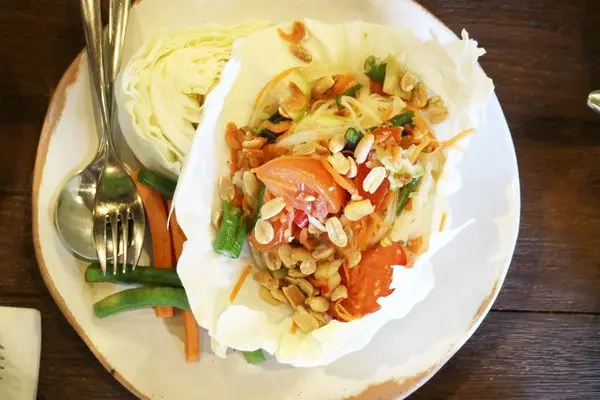 Thai J 以高麗菜捧著青木瓜伴著新鮮水果以及些許花生配料等等的方式呈現