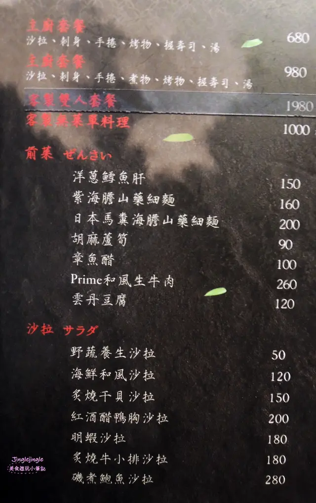依序是刺身、沙拉、煮物、握壽司、烤物、手卷、湯品、甜品