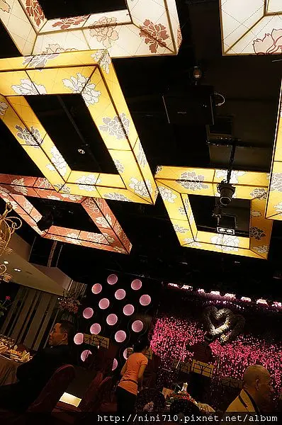 宴會廳燈光關掉後很有氣氛呢!感覺舞台上都是亮片,好閃亮亮ㄚ!主桌的佈置最讚的是,楊董竟然不收禮金,反而還送賓客們他自己自製的楊董牌鳳梨酥,這也太妙了吧!
