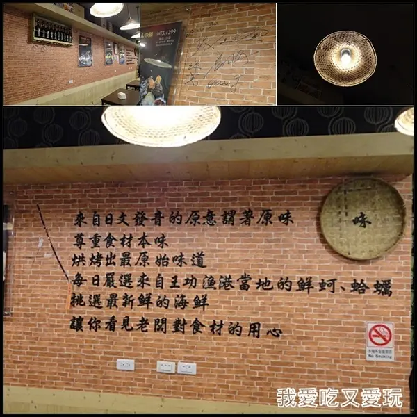 店內看似還蠻有農莊風味,抬頭仰望電燈戴著斗笠,牆面紅磚瓦簽有名人簽名