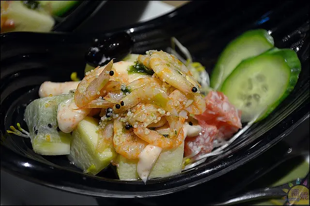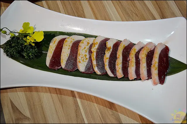 山藥刨成細絲再佐上魚卵搭配梅子醬,山藥本身比較無味要攪拌後再吃會更有風味,口感帶稠滋味微酸很清爽開胃