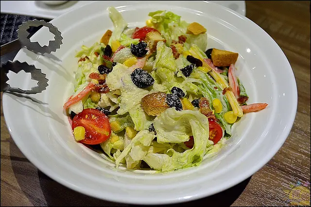 商妮選擇凱薩醬風味,沙拉份量不少,大新鮮蔬果加上起司粉凱薩醬,4人分食剛剛好