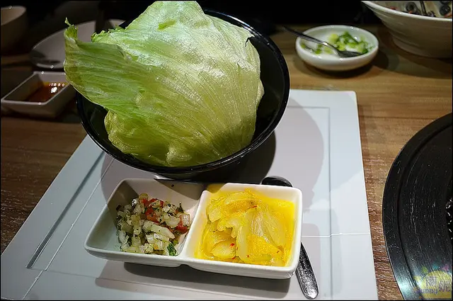 這一份黃金泡菜搭配義式洋蔥以及生菜葉,是包燒肉的好朋友,整盤都可以無限續點