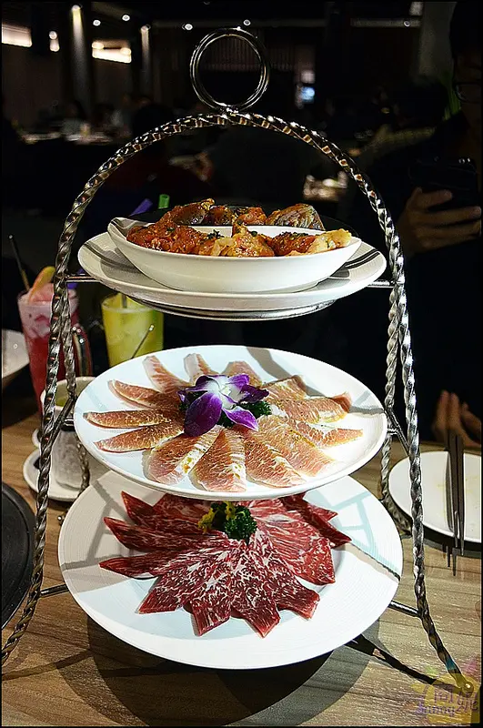主食上桌是以英式下午茶的三層架裝盤,氣勢不錯又省空間,打卡就拍這一張了~