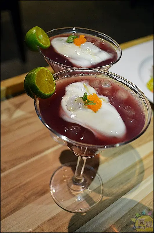這一杯應該是只有在老井才吃的到的創意料理,將生蠔浸泡在蔓越梅醋中再鋪滿蘆薈丁