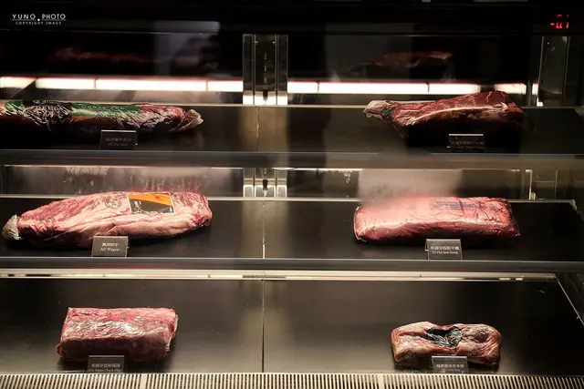 展示中的牛肉切片以低溫熟成後真空透明包裝 看起來格外誘人