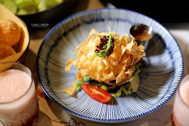 這個沙拉很特別 將溏心蛋裹上春捲皮酥炸至外酥內軟 一刀切開時 蛋黃立刻流出