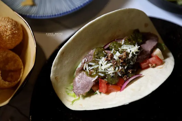 包裹在軟糯的捲餅中 每一口都充滿牛肉的鮮美與青醬的香氣 帶來豐富的層次感