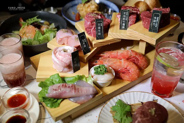 紐西蘭牛菲力、美國安格斯牛霜降、美國平鐵牛排、松阪豬、船釣小卷、美國玉米雞還有阿根廷海紅蝦、北海道大干貝 超級豐盛的!