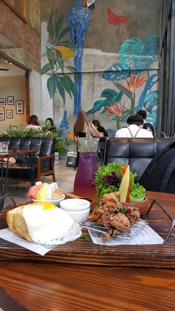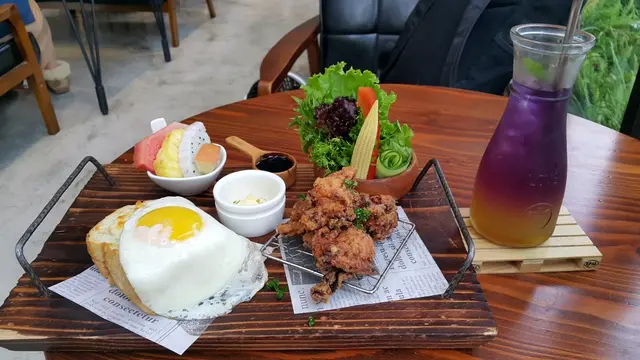 點了個all day breakfast 。名稱係唐揚炸雞黏貼貼,價錢280台幣。蔬菜很新鮮,吐司弄得剛剛好,唔會太燶,而且加了蛋在上面一齊食,好滑溜。炸雞亦炸得好,炸炒唔厚,保留雞嘅原味道,加埋他他汁一齊食,真好食。最後仲有幾塊生果,店主真體會到食完熱氣食物都要注重健康。